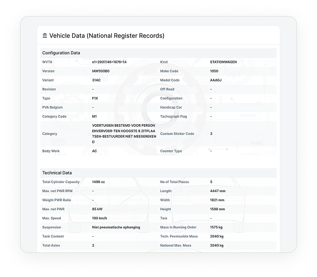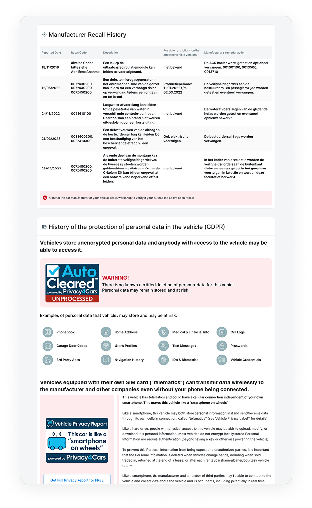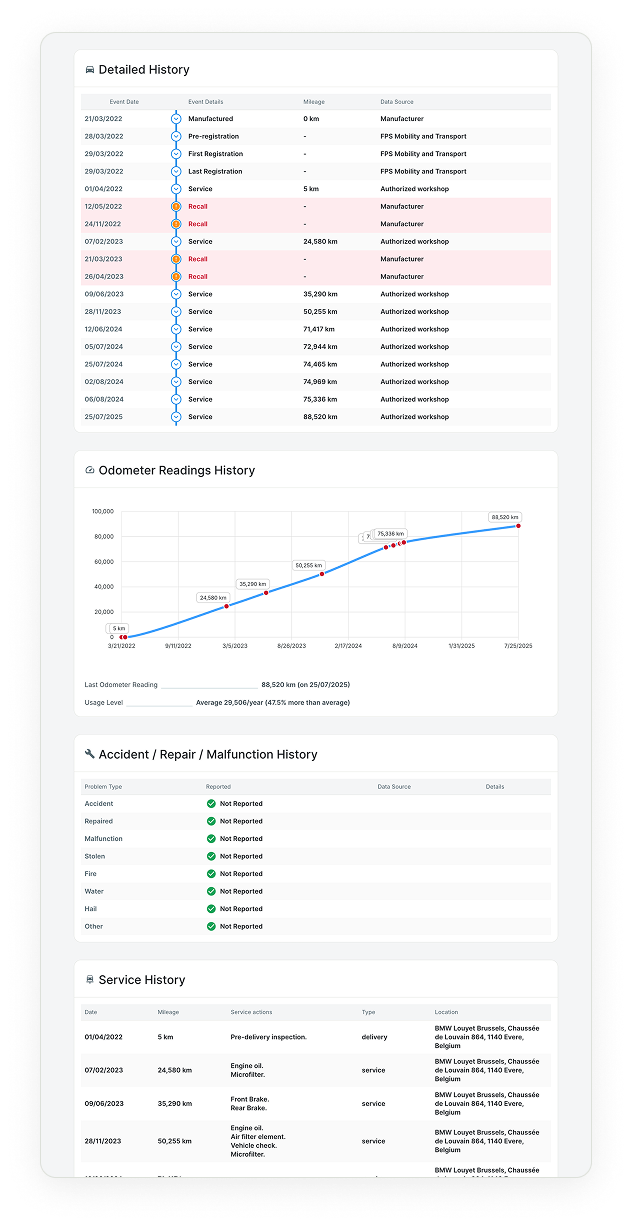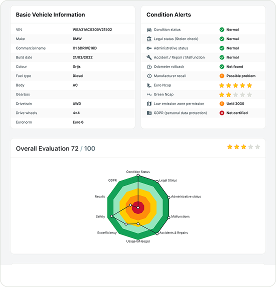 CAR VX provides information about the vehicle’s title, registration, and usage history. Each report displays the results of our comprehensive search for salvage or junk vehicles; damage from hail, flood, or fire; mileage discrepancies, or odometer rollback. CAR VX also looks for records of theft, manufacturer recalls, vehicle safety grade information, Eco-efficiency, and personal data treatment.