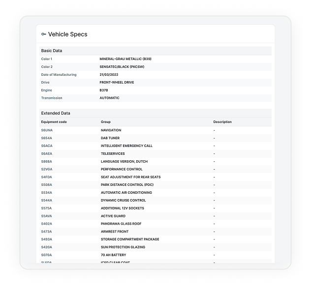 The number of information blocks in CAR VX Report and their contents may differ depending on the brand and the year of manufacture of the vehicle. - Coming soon...